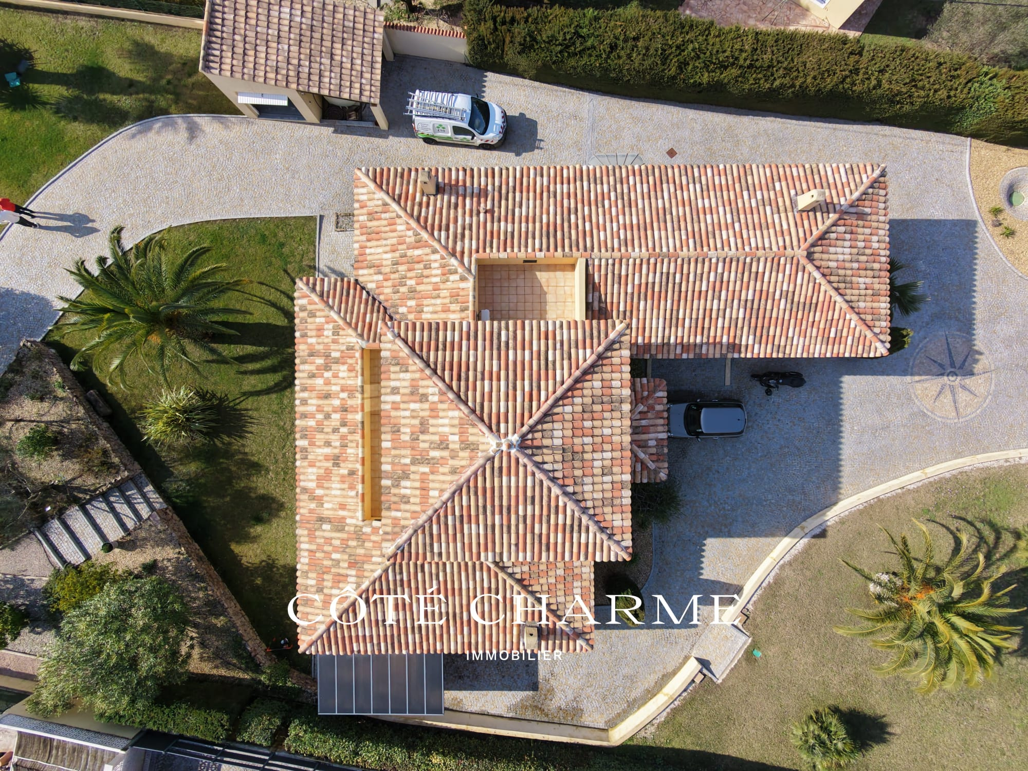 Dès l’arrivée, le portail s’ouvre sur une cour pavée témoignant du soin apporté à la construction et à l’entretien de la propriété. Cet espace permet le stationnement de plusieurs véhicules, soit dans la cour, soit à l’abri sous le carport.