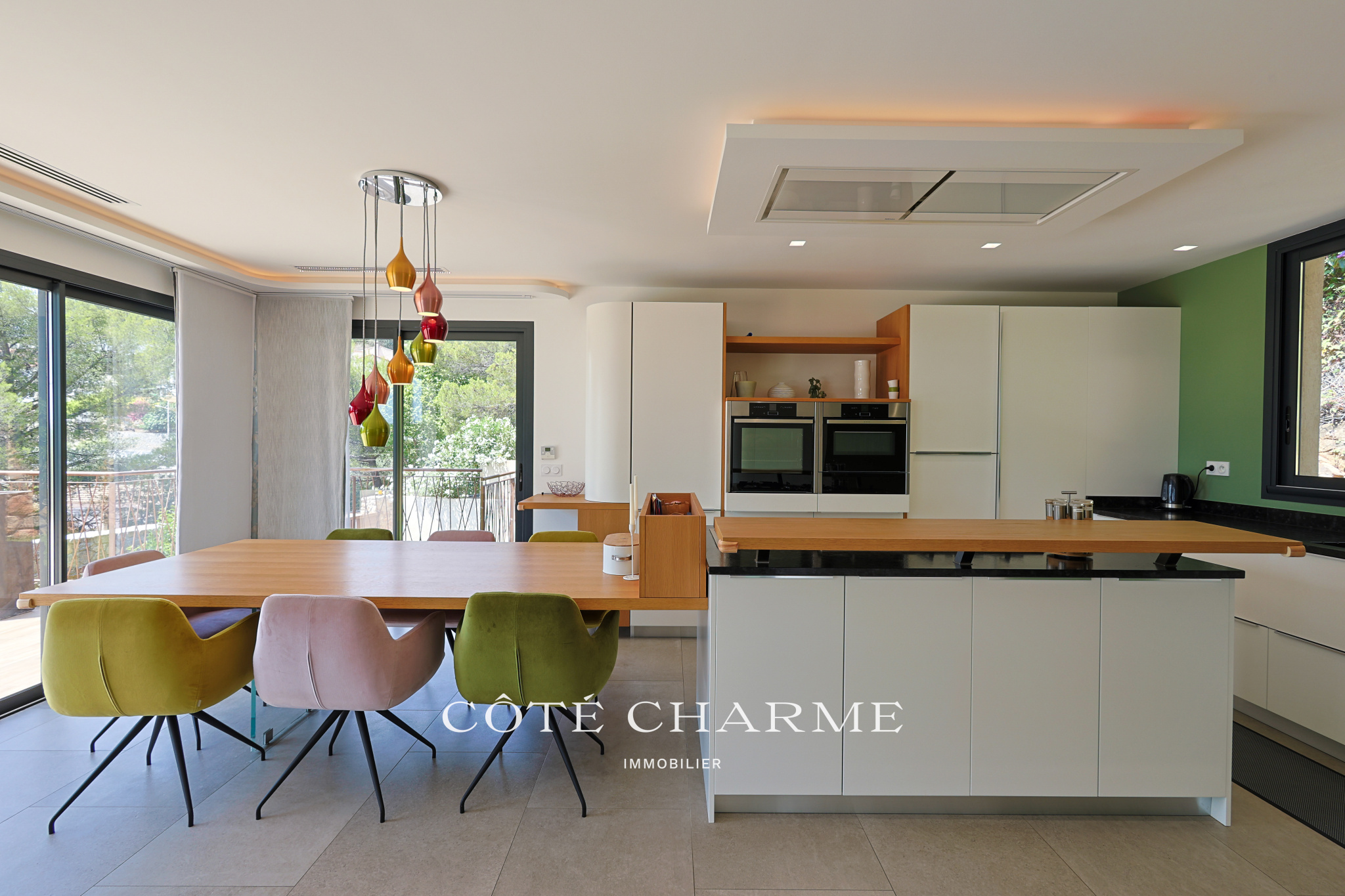 La cuisine, conçue sur mesure autour d’un îlot central, s’intègre parfaitement à cet espace ouvert. Dans le prolongement, une vaste terrasse d’environ 70 m² avec piscine chauffée devient le cœur de la maison, idéale pour recevoir ou se détendre en toute intimité.
