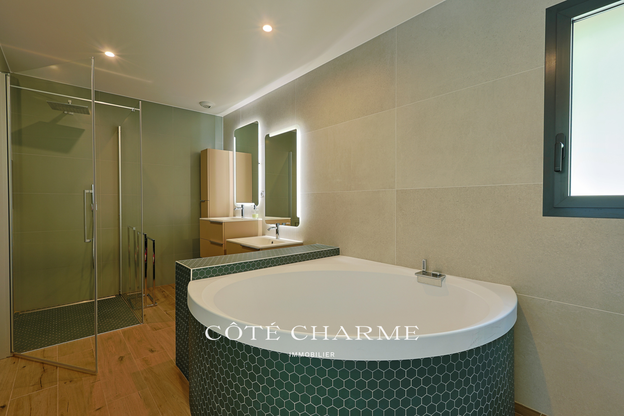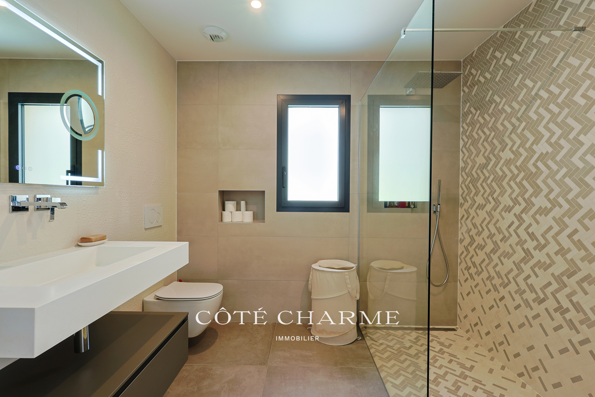 Côté confort et technologie, rien n’a été laissé au hasard : domotique, climatisation réversible gainable, adoucisseur d’eau, arrosage automatique, visiophone connecté, vidéosurveillance, alarme volumétrique… Une buanderie, une blanchisserie et un local technique viennent parfaire les fonctionnalités de cette demeure.