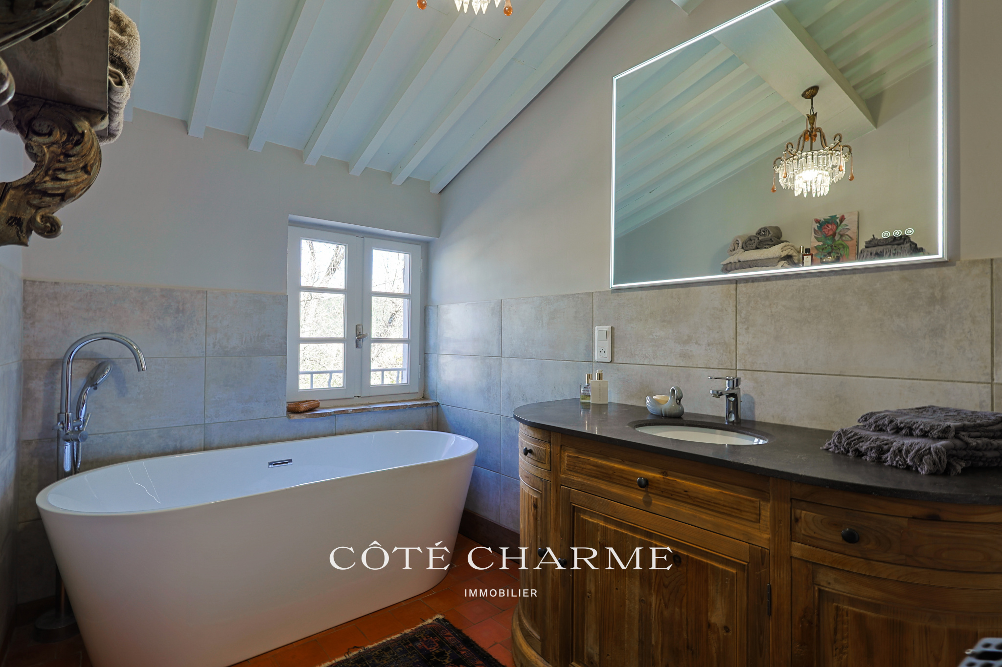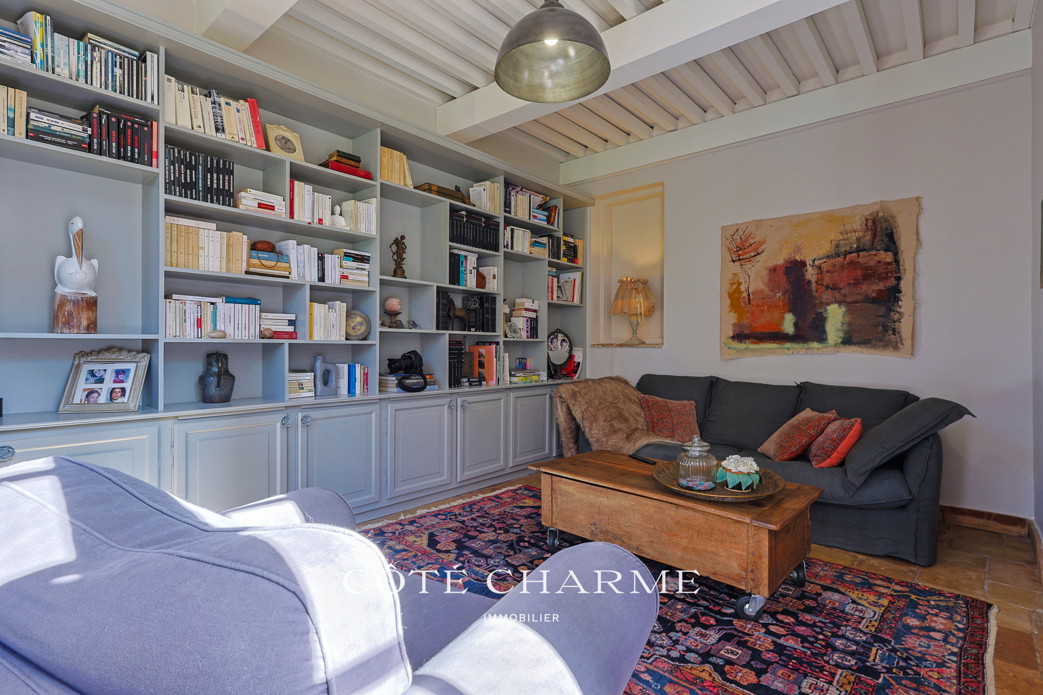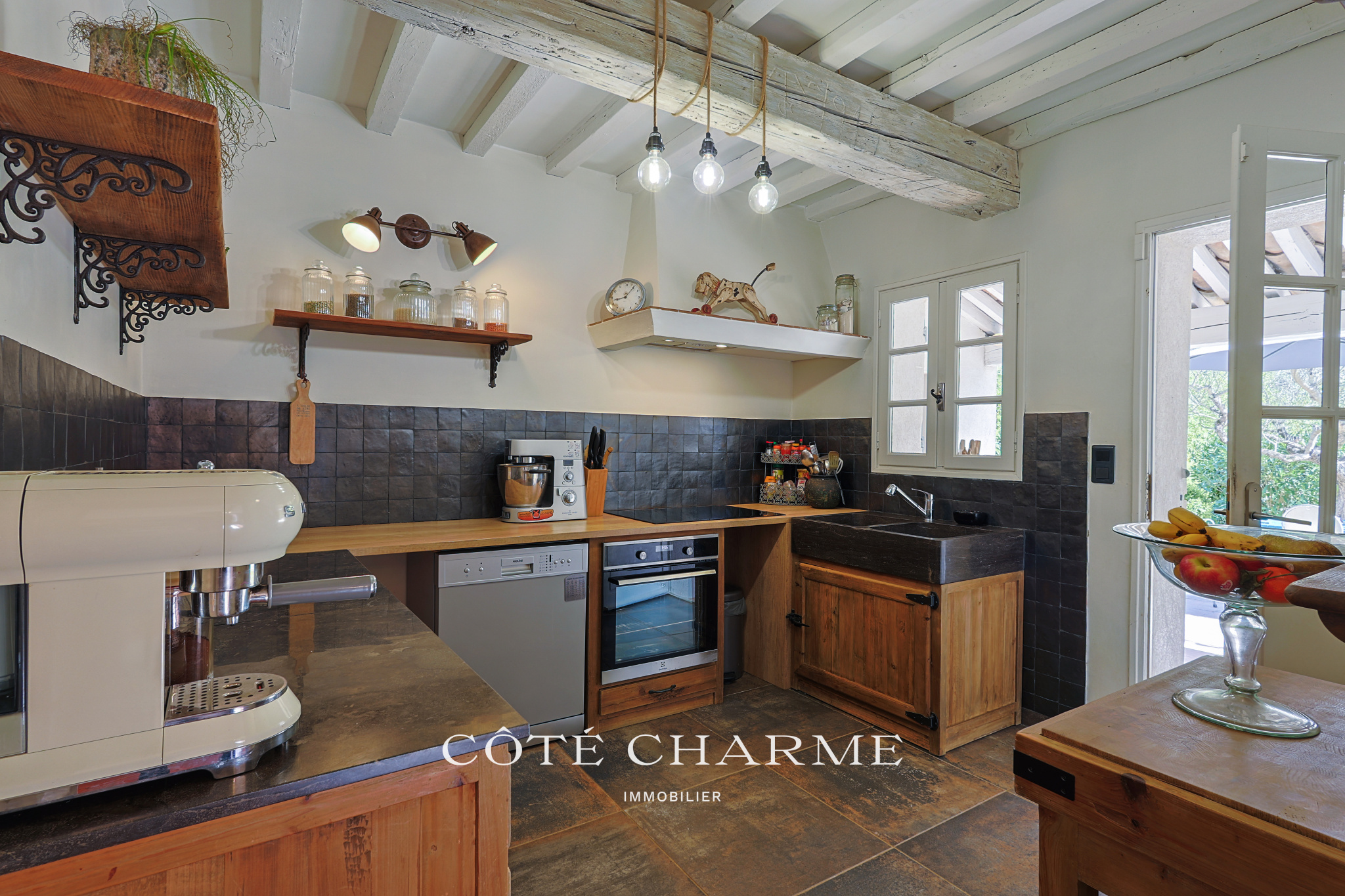 La bastide, d'une surface totale de 140m², comprend sur un premier niveau, une cuisine équipée indépendante avec accès terrasse et cuisine d'été de 15m². Un double séjour avec un espace bibliothèque et cheminée, le tout agrémenté de poutres apparentes offrant un cachet remarquable et pouvant se prolonger sur une seconde terrasse des plus intimistes. Une salle d'eau avec douche à l'italienne et un WC.