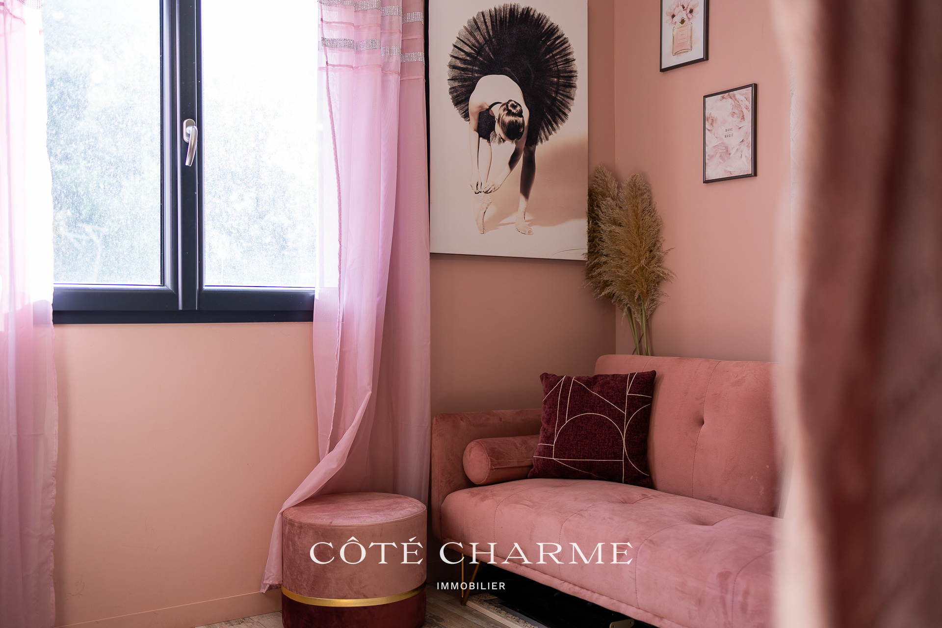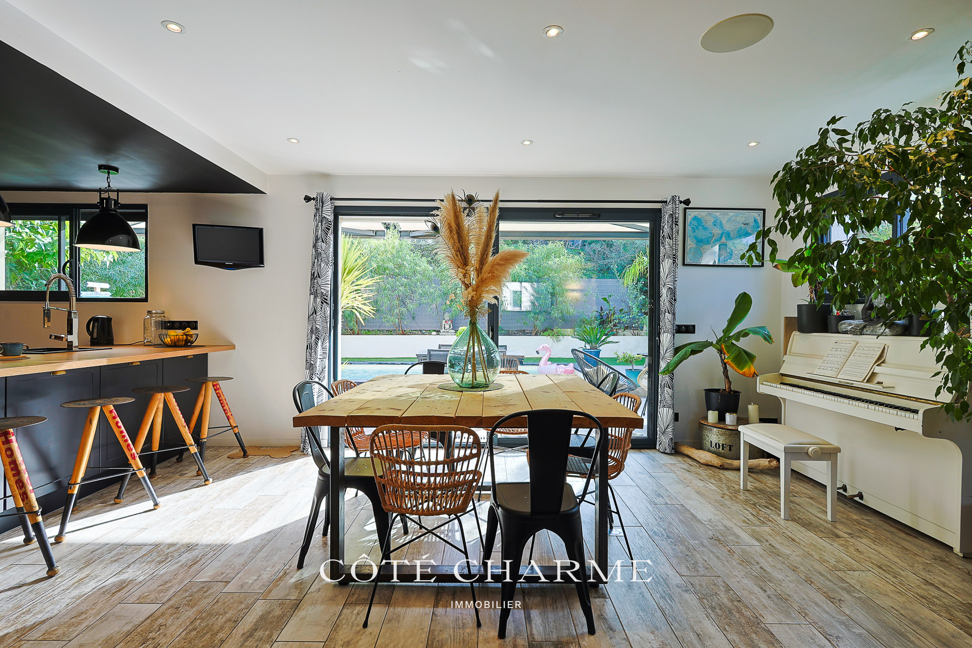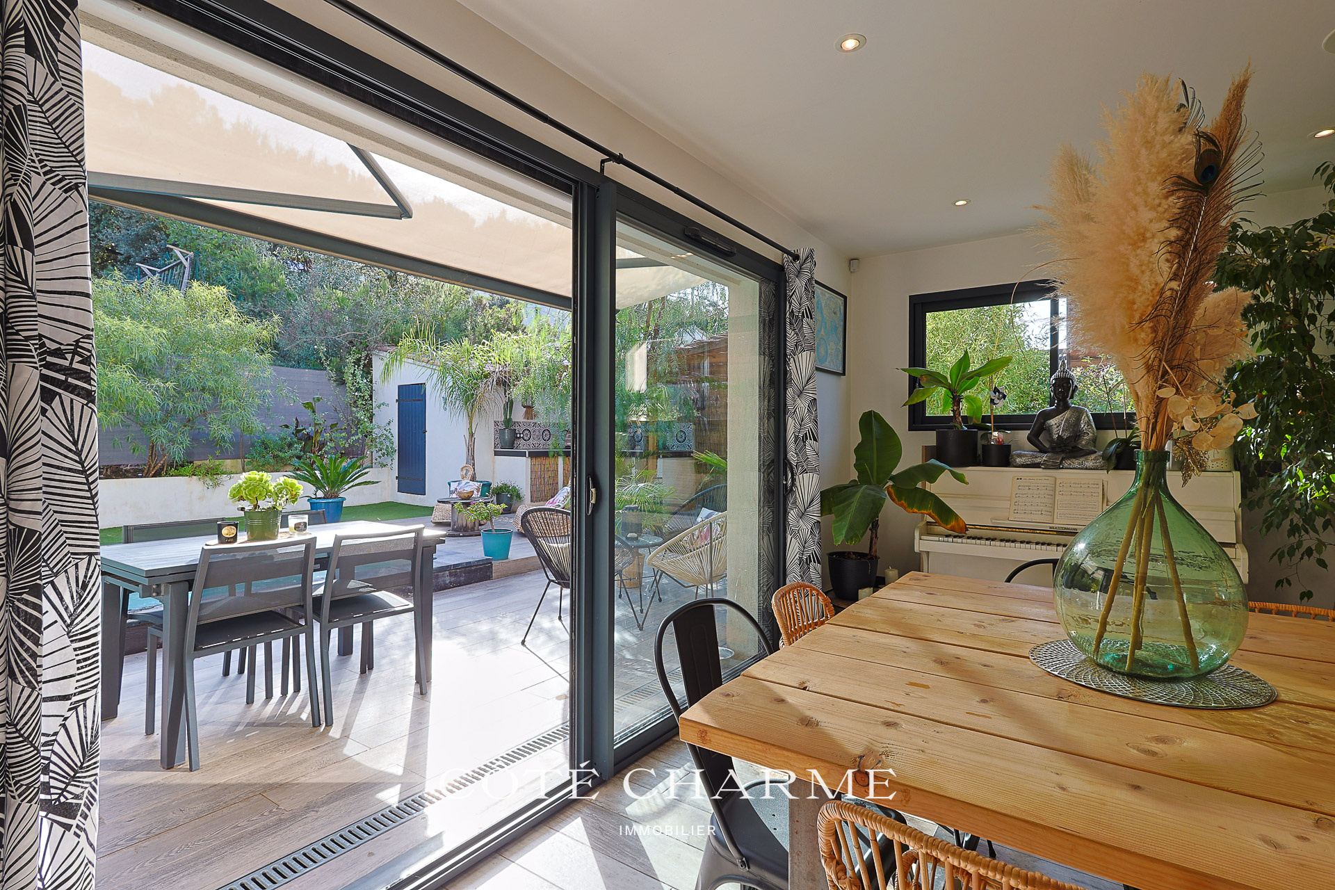 La pièce, baignée de lumière grâce à une large baie vitrée exposée plein sud, vous propulse littéralement vers l'extérieur et le jardin joliement arboré et parfaitement conçu.