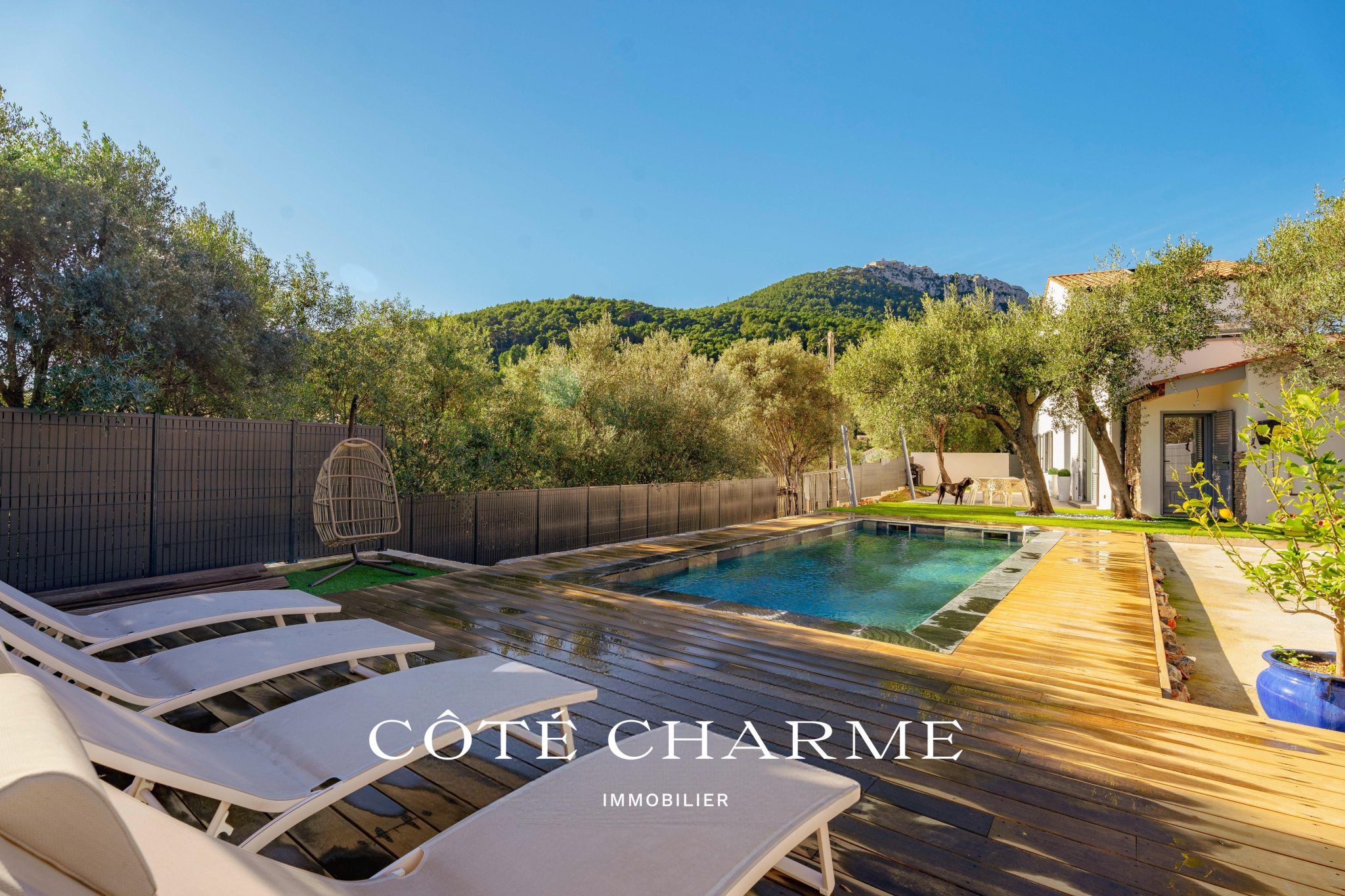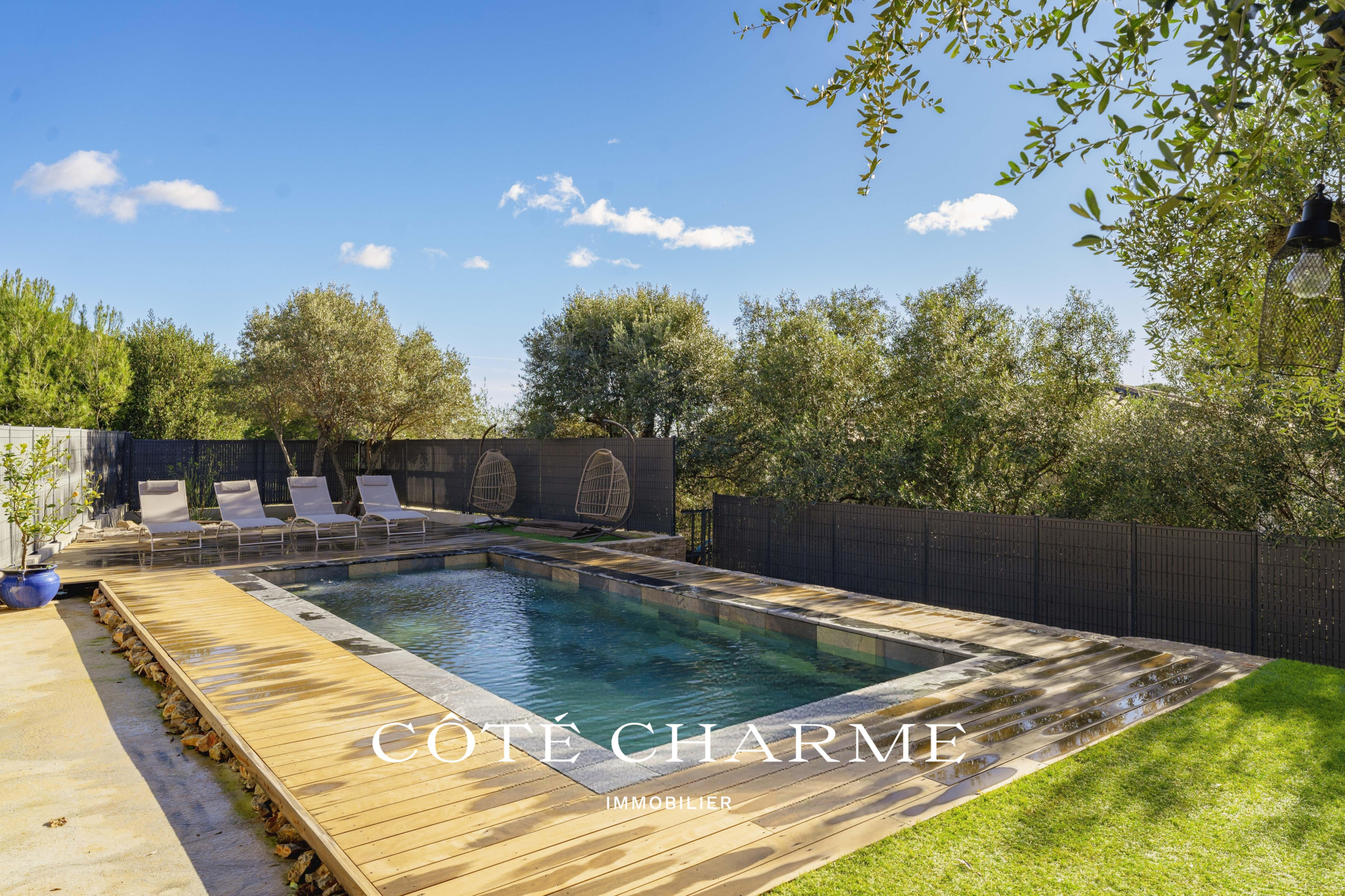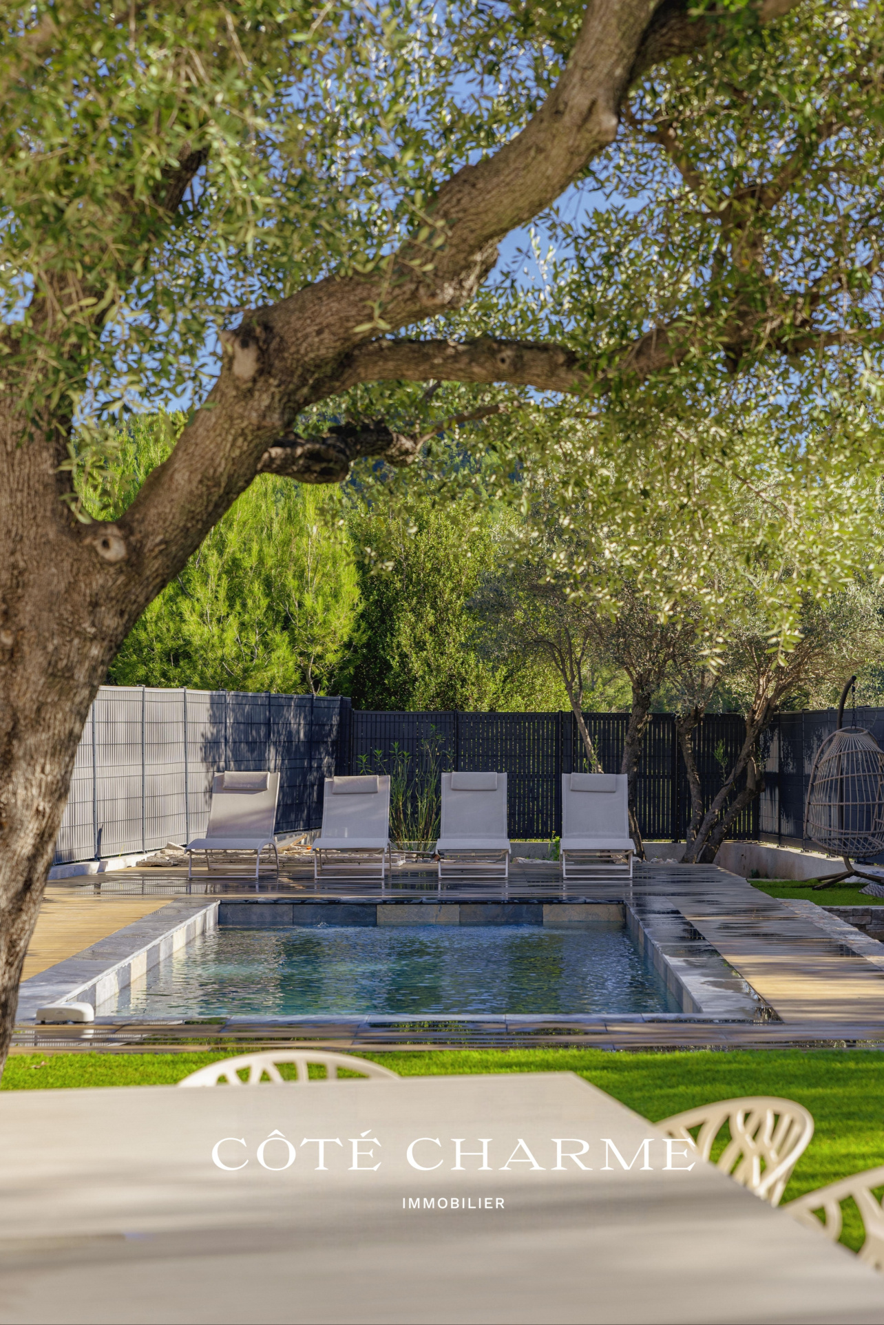 À l’extérieur, une large terrasse carrelée prolonge naturellement l’espace de vie. Autour, les oliviers dessinent un décor méditerranéen apaisant. Et puis, il y a la piscine. Une piscine traditionnelle, entièrement carrelée en pierre de Bali, aux reflets profonds et raffinés. Aucun vis-à-vis, une exposition plein sud, un ensoleillement optimal.