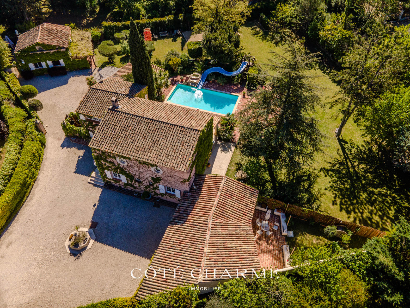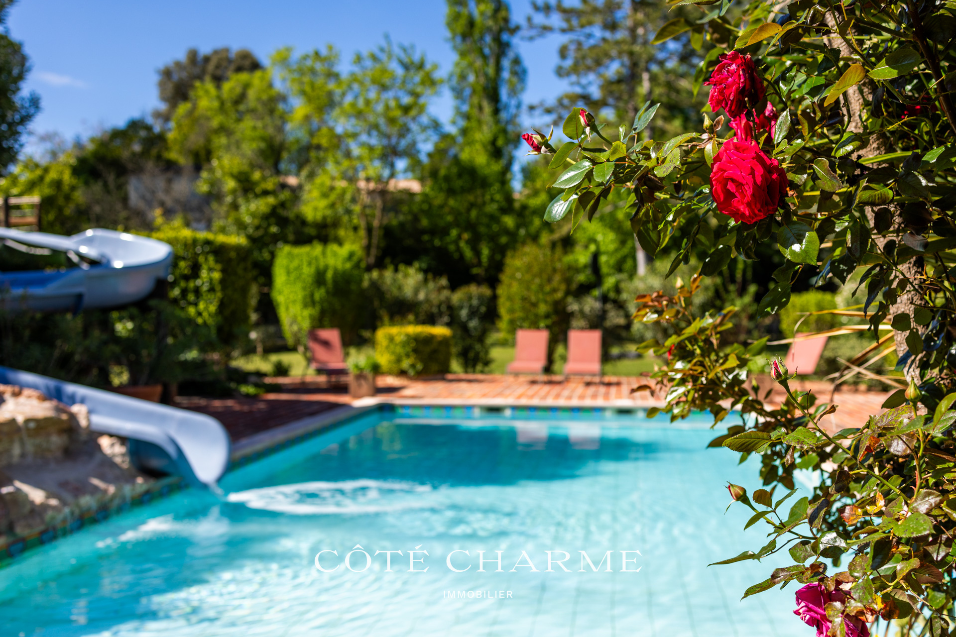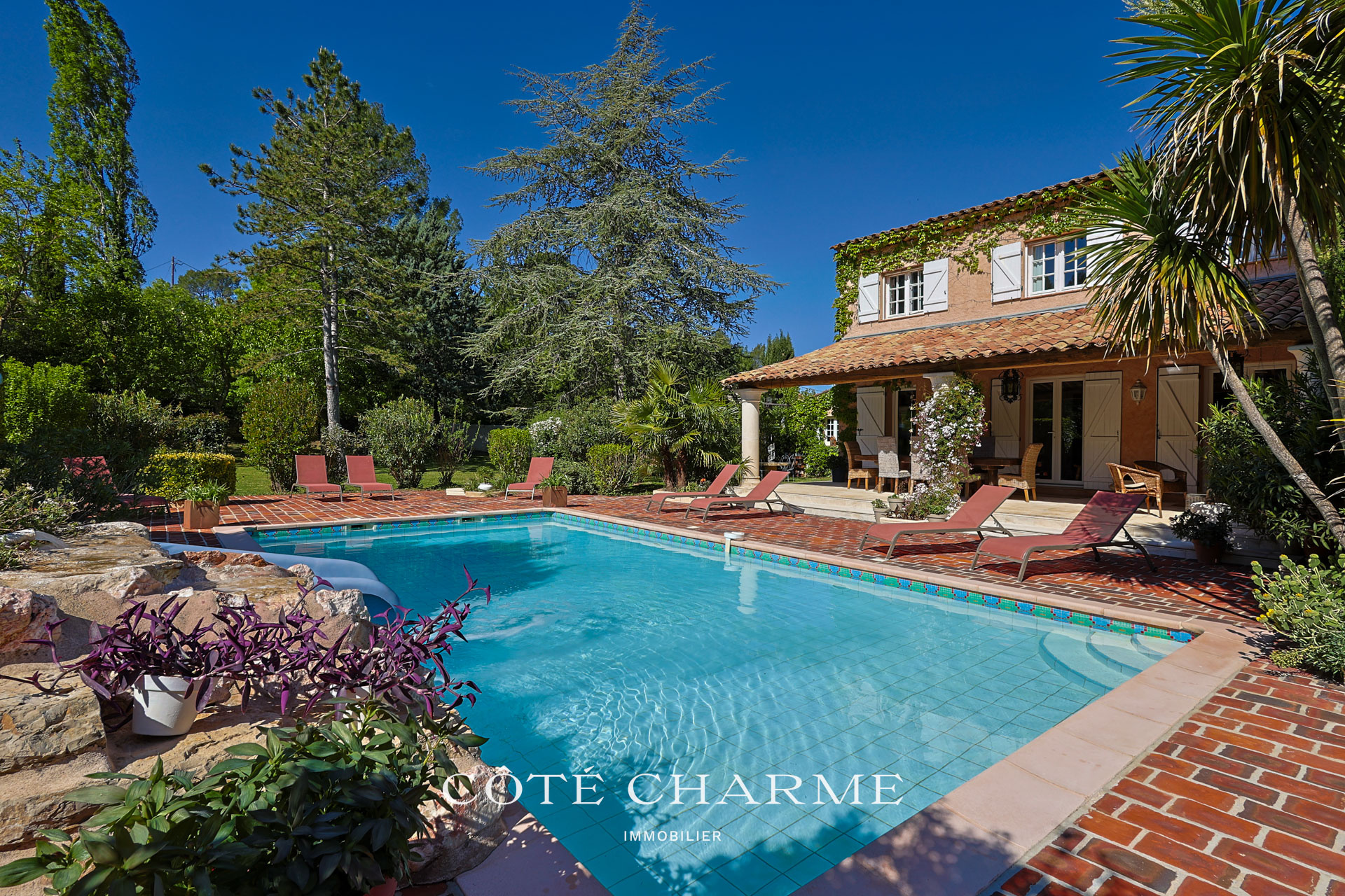 La piscine, de construction traditionnelle, élément incontournable d'une maison en provence, est dotée d'un toboggan et d'une cascade. Elle prend place au coeur d'un extérieur parfaitement articulé, magnifiquement arboré, offrant de multiples possiblités pour des moments de détente et de dépaysement.