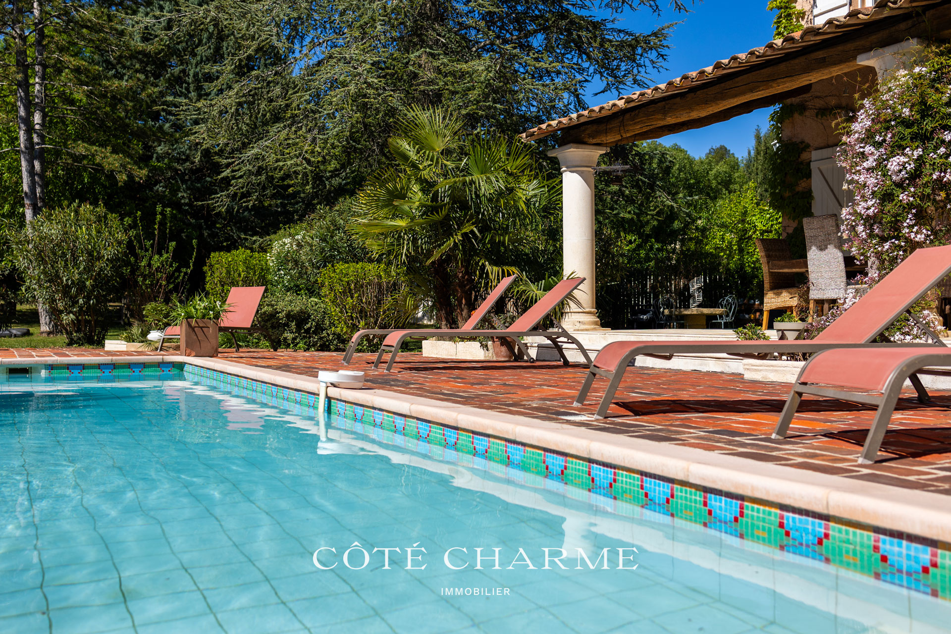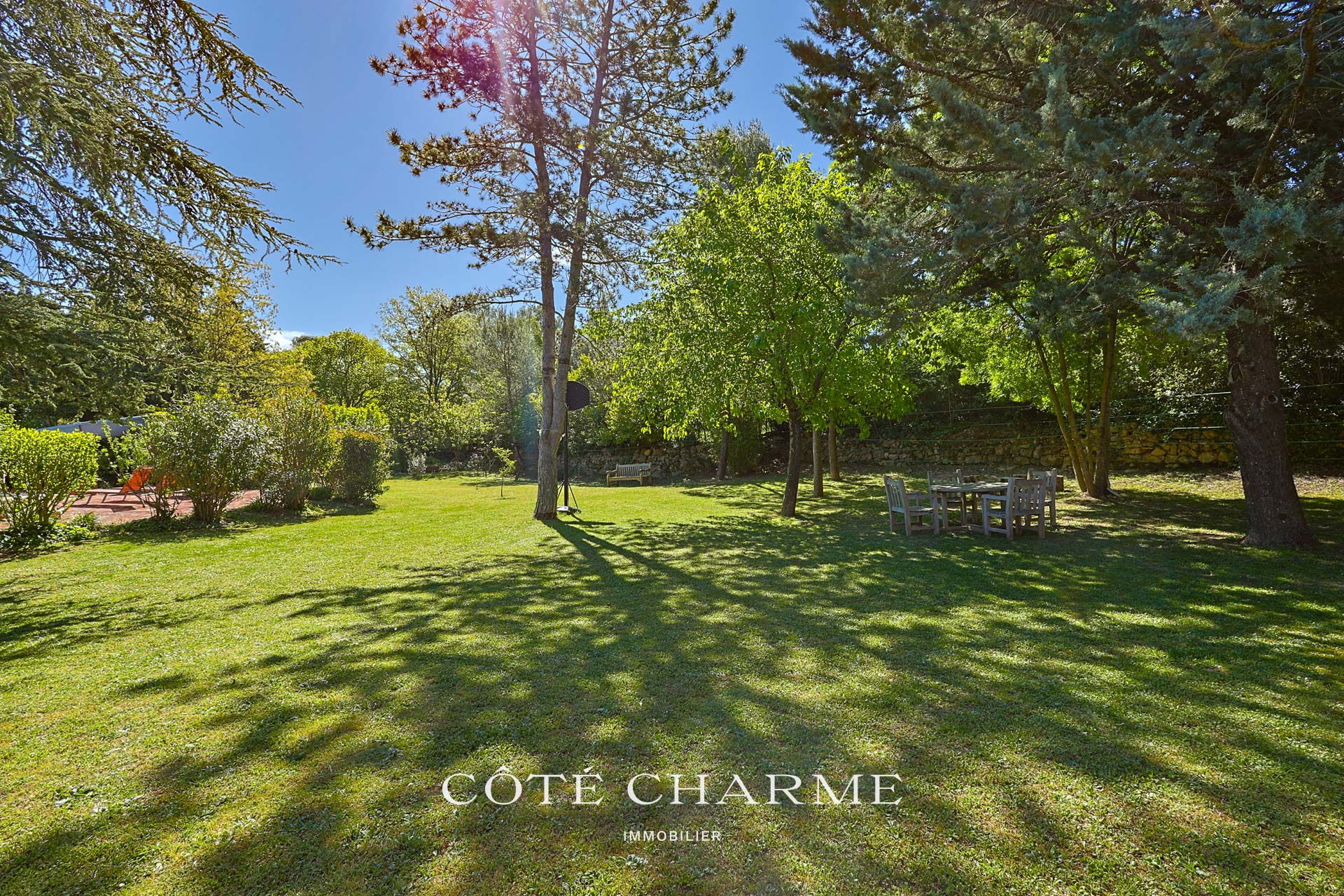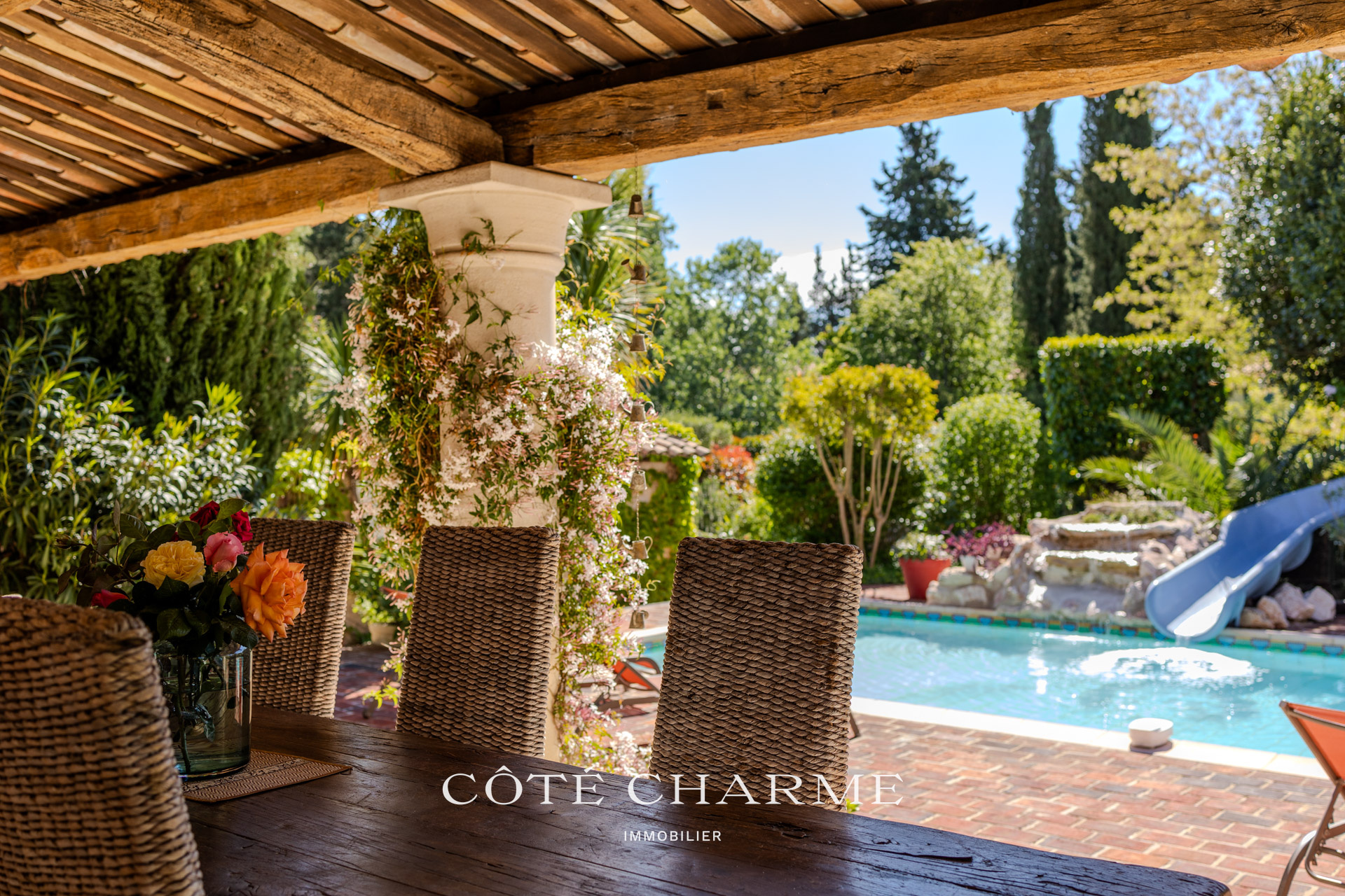 La piscine, de construction traditionnelle, élément incontournable d'une maison en provence, est dotée d'un toboggan et d'une cascade. Elle prend place au coeur d'un extérieur parfaitement articulé, magnifiquement arboré, offrant de multiples possiblités pour des moments de détente et de dépaysement.