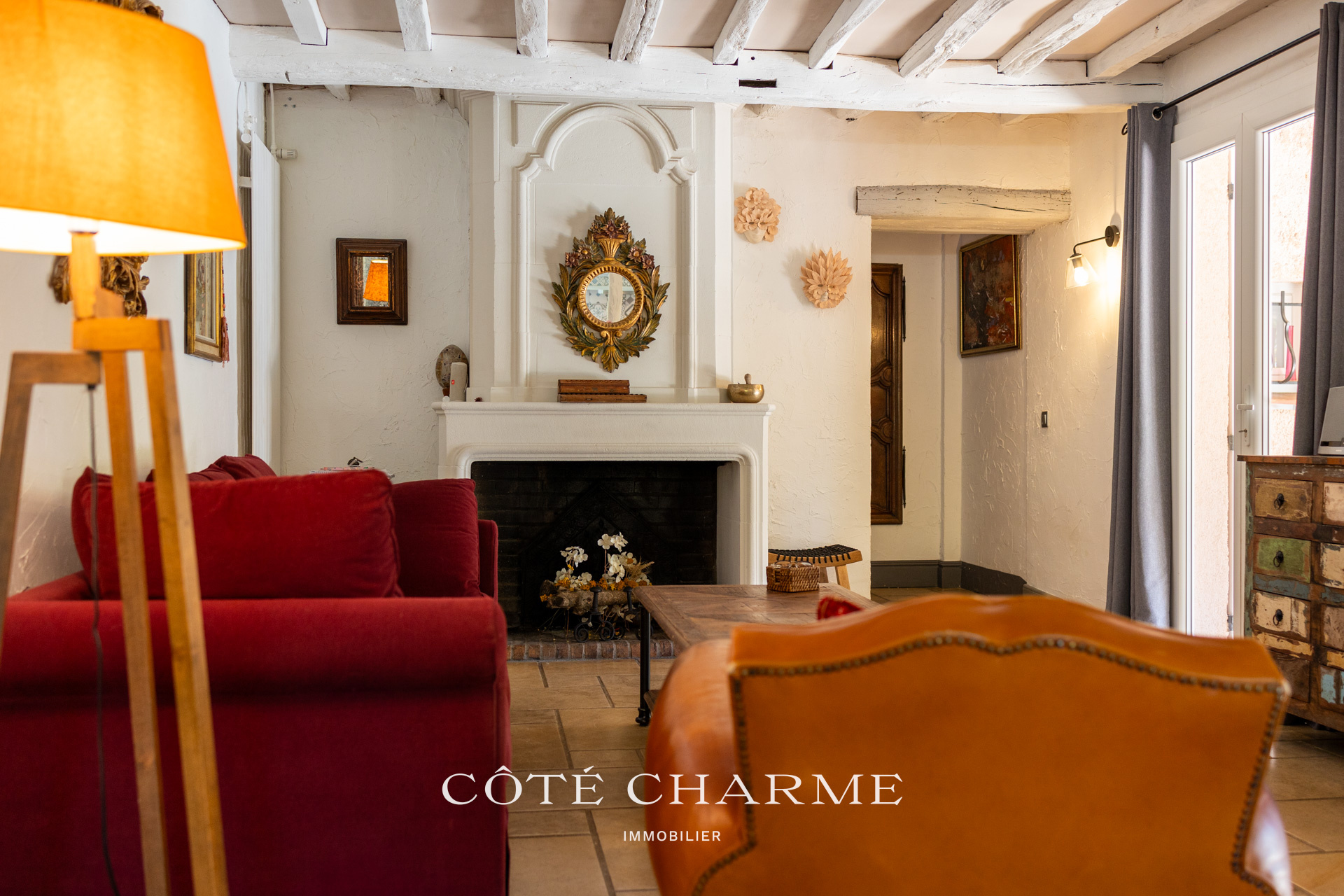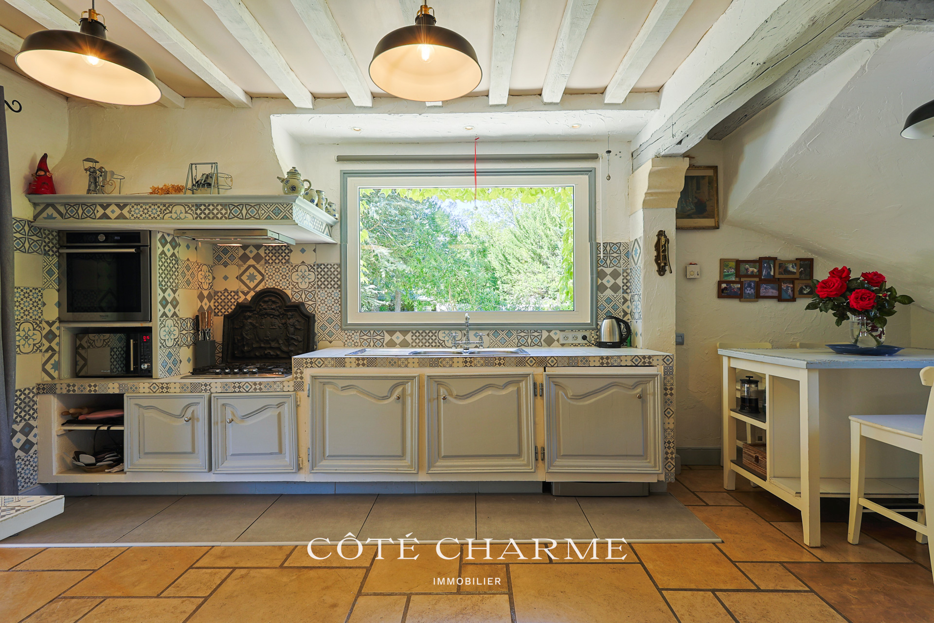 On entre dans la maison principale, au rez-de-chaussée une grande pièce aux de vie aux poutres apparentes avec cheminée, ainsi qu'une cuisine équipée et dotée d'une fenêtre fixe donnant la sensation de cuisiner à l'extérieur. La baie vitrée du salon donne l'accès à une spacieuse terrasse ombragée, idéale pour les repas en famille ou entre amis.